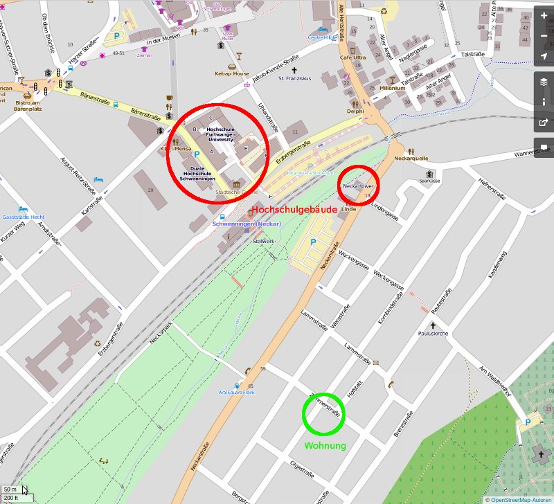 Die Wohnung liegt in der Nähe der Hochschulen, so dass alle Einrichtungen problemlos in wenigen Minuten zu Fuss erreicht werden können.